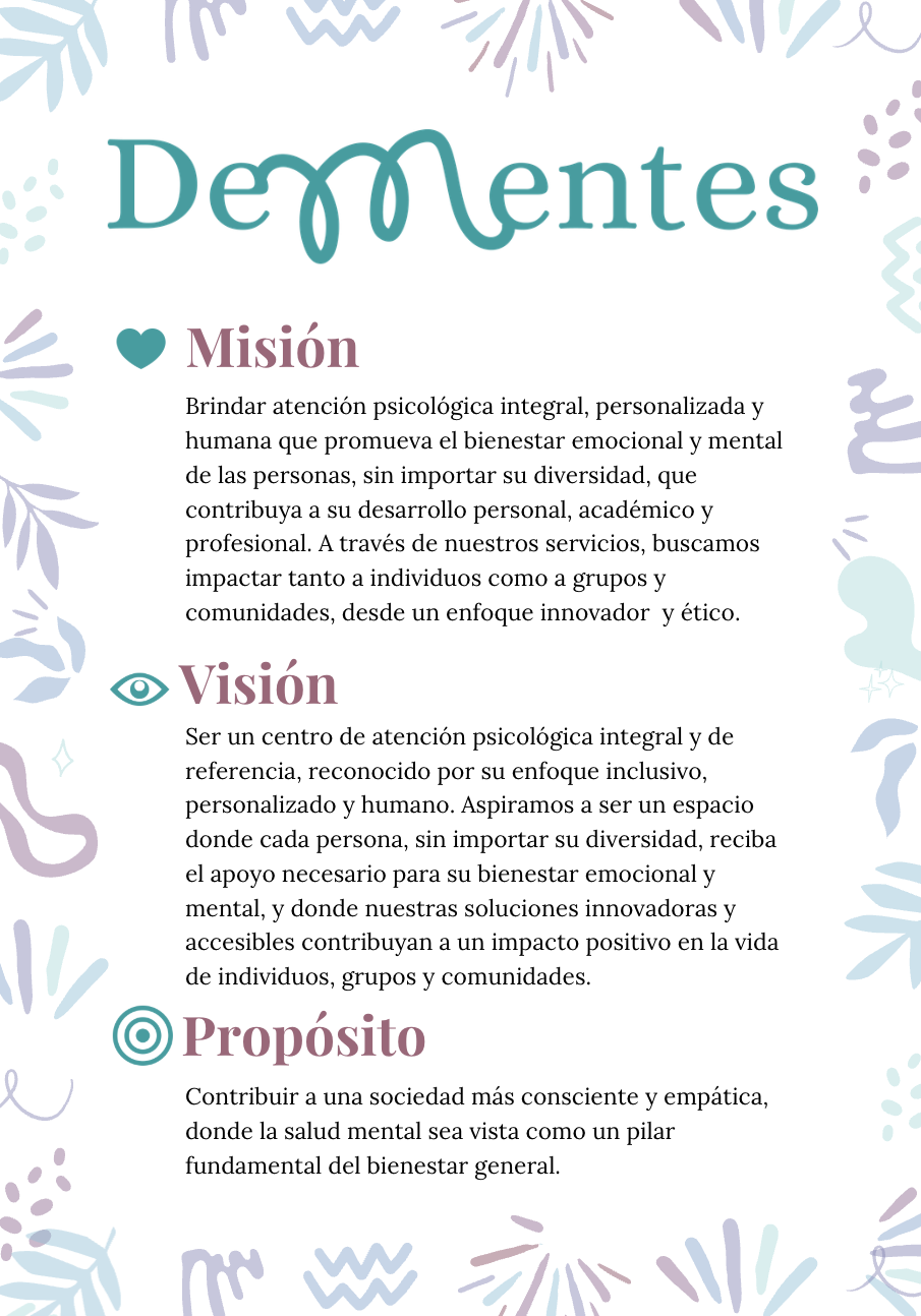 Somos DeMentes nace de nuestra pasión como psicólogas por acompañar a las personas en su camino hacia el bienestar mental y emocional. Creemos en una atención que no solo sea profesional, sino también cercana, humana y profundamente personalizada. Nos enfocamos en ofrecer servicios integrales que respondan a las necesidades únicas de cada persona, grupo o institución, reconociendo y celebrando todas las formas de diversidad, incluyendo neurodivergencias, identidad de género, orientación sexual, raza y cultura.